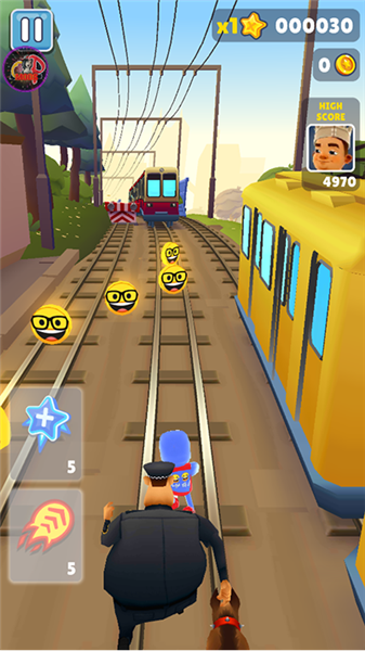 玩家经常遇到的一种情况。左右两路没有任何障碍,中路有5~6辆火车奔过来。为了能够把车上的金币吸收干净,这个时候就可以运用基础组合跳滚了,前提是不要玩得太很,稳一些较好,如果火车还没到达玩家下方,玩家就已经在半空中往下划那么就只有死翘翘了。