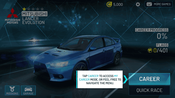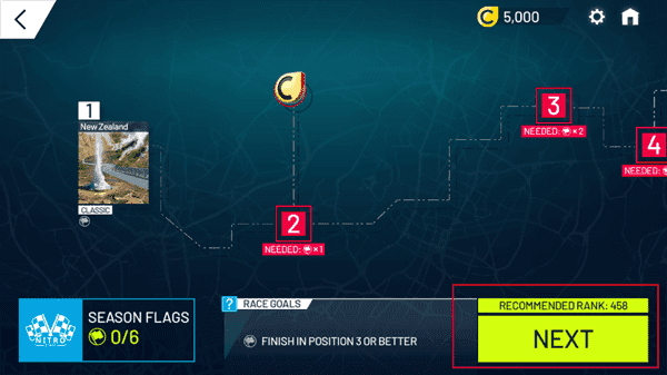 5.获得新的皮肤,就可以开始新的一场赛车比赛了。点击“CAREER”进入游戏场景切换;然后点击“NEXT”选择要比赛的汽车,最后就是点击“PLAY”开始游戏啦!