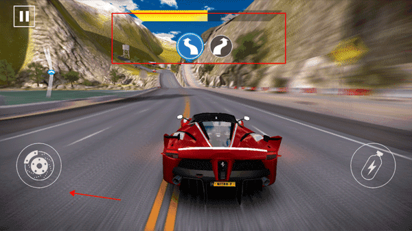 3.接下来会有一项新手指导。左边按钮是方向盘,右边是加速按钮。如果想切换路段,就根据情况来左右滑动屏幕,让车改变车道就行了。
