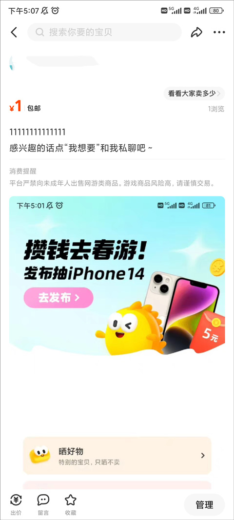 买家如果对价格感觉不太满意,则可以利用该功能,与售卖的人进行商议,从而以更合适的价格进行收入。值得提出的是,该软件是十分安全的。使用该软件进行售卖和买入的人都是实名制的,并拥有一定的措施进行保证。用户可以安心的购买。软件中拥有多样的商品,用户可以根据自己的需要进行搜索,也可以根据软件中的分类,自行的发现。