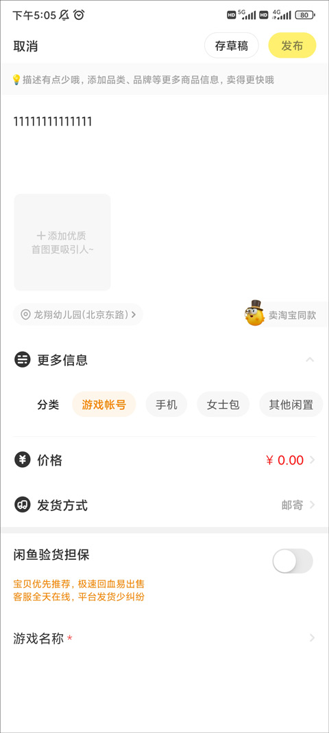 3、上方的【描述框】,输入对当前商品状况的描述信息,然后选择要使用的商品图片