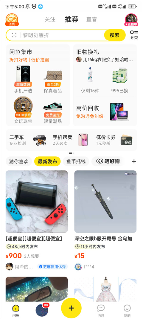 1、点击打开闲鱼二手市场旧货市场app,选择右下方【我的】登录客户端,点击【+】选择发布的类型。