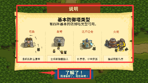 3、这里有四重防御塔类介绍点击了解了就可以游戏吧。