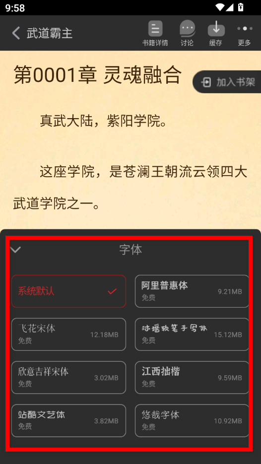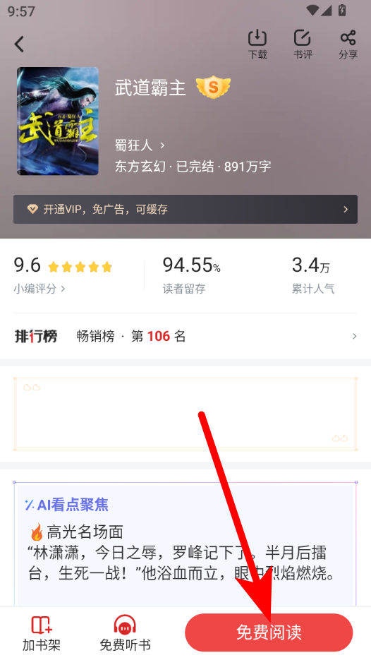 1、在追书神器小说详情页面,点击免费阅读,进入小说阅读页面。