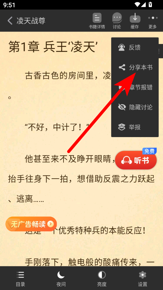 4、在功能菜单中,点击分享本书选项,即可将小说分享给别人。
