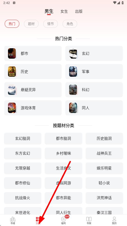 2、在分类页面,根据性别偏好选择男生或女生频道,比如点击女生,再从热门分类或按题材分类中,选择感兴趣的小说类别,如现代言情。