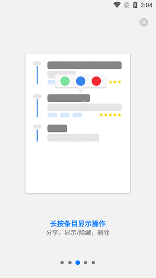 3、长按日记条目显示操作,隐藏/分享/删除。