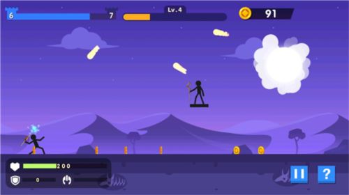 8.如图这种手持法杖的火柴人发射的是火球,火球落到身上会让你的生命力下降,你手中的武器也可以打破火球;