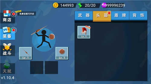 该游戏装备有四个:武器,盾牌,头盔,披风。武器增加玩家的攻击力,盾牌抵挡正面伤害,头盔抵挡上方的伤害,披风增加生命值。