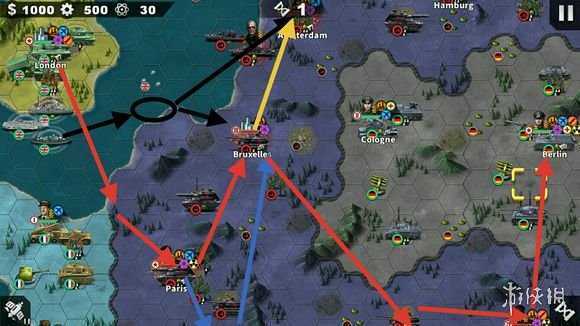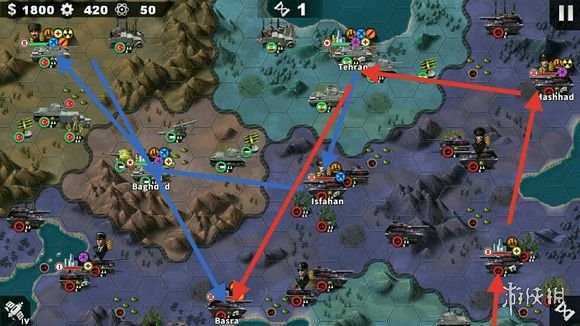 右上角城中将领出去后大部队攻城,之后分兵古帅跟个轻坦按蓝色路线攻城清理小兵,别管对面坦将,大部队占德黑兰并晕住2个将,留一个谣言将永晕,大部队和古帅汇合布拉格并打死那个坦将。(优先打进城的将)