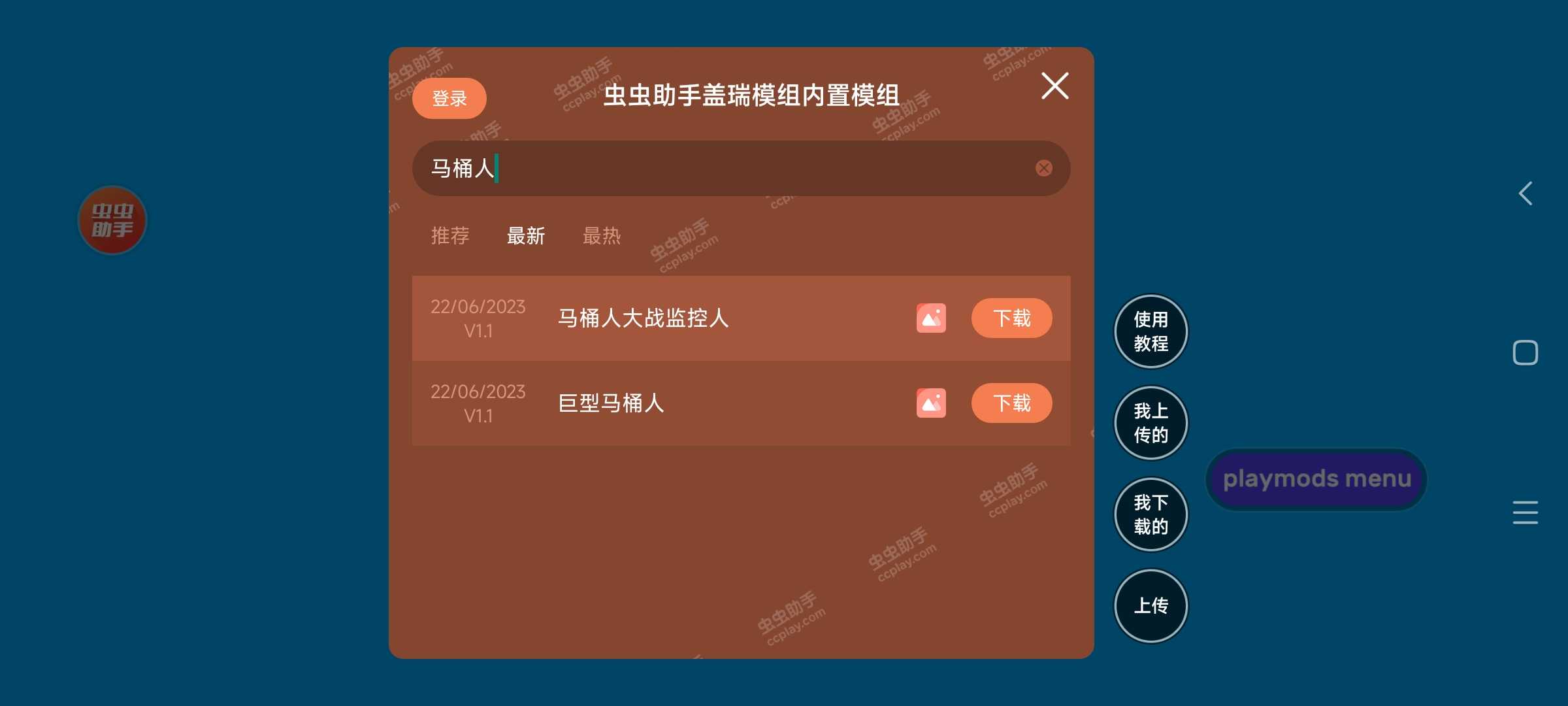 2、点击红色的虫虫助手按钮,然后在搜索框搜索马桶人。