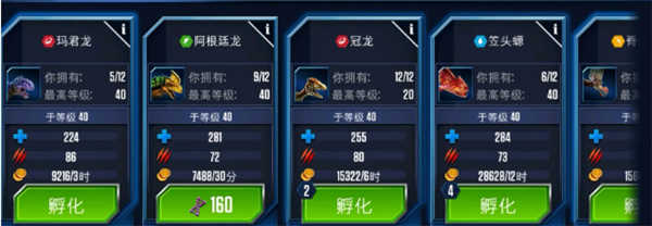 4、孵化所:每一只恐龙的诞生都必须经历一个孵化过程,游戏为玩家免费提供了一个免费孵化器,玩家花费现金可解锁更多孵化器,更快培育恐龙。