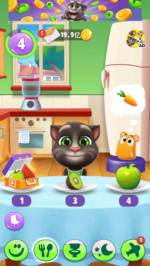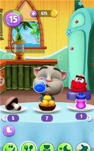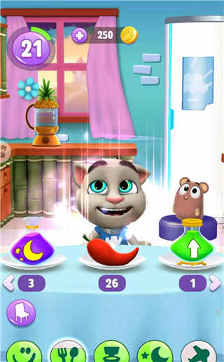 游戏的主要内容是照顾一只汤姆猫宠物,而想要照顾好汤姆猫那肯定要给汤姆猫喂食。喂食的地方在厨房,给汤姆猫吃食物从而减少饥饿值,增加经验值好快速升级。汤姆猫所吃的食物都是要买的,若是没有食物了就点击汤姆猫身后冰箱,冰箱是商店的入口,可以在商店里买到汤姆猫所需的食物。