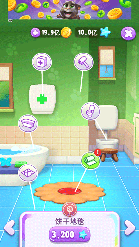如果你发现汤姆猫变得脏兮兮的话就要给汤姆猫洗澡,点击厕所里的浴缸,汤姆猫就会到浴缸里去,我们挑选一个肥皂给汤姆猫洗澡。等汤姆猫全身的是泡泡的时候我们再拿汤姆猫头上的花洒冲掉泡泡。