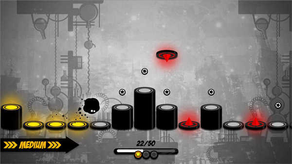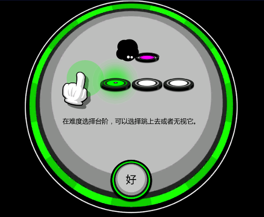 下台阶就不需要点击了,如果你想快点完成任务的话,在安全的地带可以快速点击让小墨球跳跃。下图出现了台阶和悬刺,就更需要把握节奏了,小墨球下落的时候准备好点击跳跃,点击落地时候节奏要统一。快速点击2下,完成落地和跳跃。难度选择台阶: