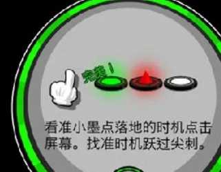 遇到一个尖刺时候比较简单,只需要找准小墨球下落的时机点击屏幕就可以完成跳跃,如果太早或者太迟的话就会碰到尖刺死亡。遇到两个尖刺的话就需要连续点击了,找准节奏的同时也需要把控好手速。