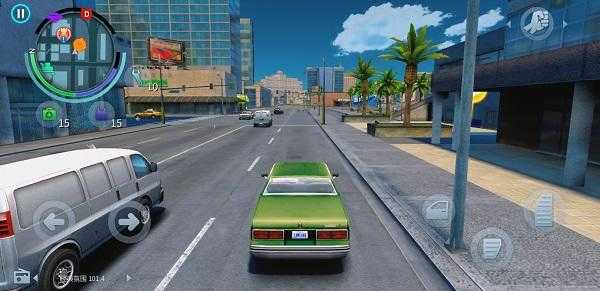 人物的生命值显示不明显,没有明确数值,其实它在圆形地图下面的小绿环,当绿环变红色就表示快挂了,游戏页面也会发红,不要随便跳下高处或者被路上的车撞,这些都会减少生命值