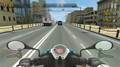 1、玩家在游戏中以第一人称驾驶摩托车在公路上驰骋,同时辅以重力感应控制,玩家只需通过晃动手机来实现摩托车的转向。在游戏的左下角和右下角分别有一个刹车键和加速键,玩家只需根据自己情况选择按哪一个按键。