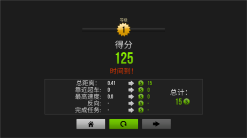 3、游戏任务分为两种:在规定的时间内到达终点和超车。终点的到达只需要你加快速度就能实现。但是超车却颇有难度,要求近距离超车,这个距离有多近需要你自己把握好度,否则就会发生车祸哦。