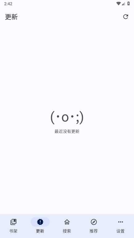 5、正版界面有五个栏目,分别是书架、更新、搜索、推荐、设置,请注意认准。