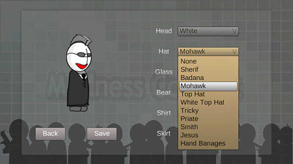 2、选择右侧的head、hat、glass、shirt等外观选项,自定义发型、眼镜、肤色以及衣服,完成后可以点击Save保存;