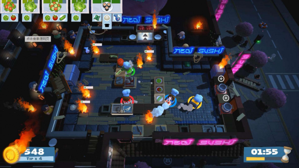 2、投掷和冲刺是很重要的两个操作,比如把生的菜投掷进锅子里就比你直接走到锅子面前放进去省时间,因为减少了无用的折返跑。