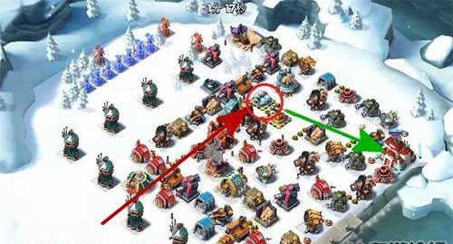 2、适合喜欢把资源辅助建筑放一起的对手。 案例进攻方案:最右侧贴墙登陆,路过狙击塔射程可放一个震荡。