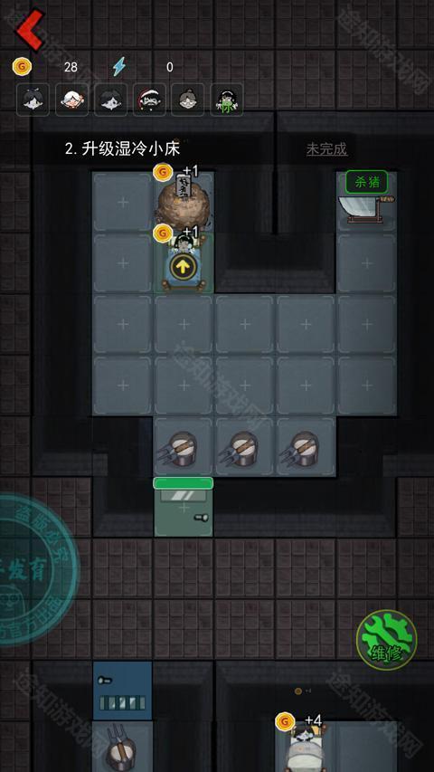 7、当它过来挠3你门的时候可以将门和小床不断的升级,这样即便没有道具它也挠不开,当门被挠了掉血的时候,玩家还可以点击下方维修按钮进行维修;