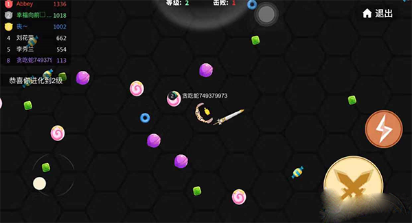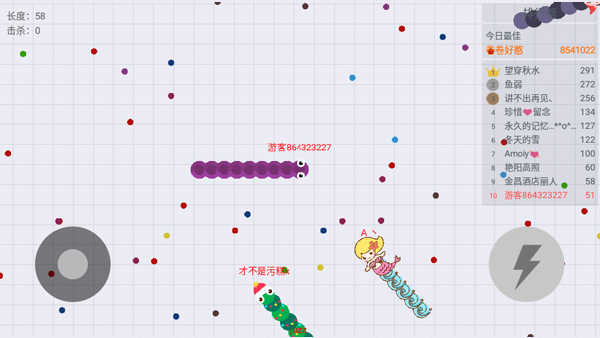当你的长度足够,就可以在地图上实现以大欺小的虐杀了。你可以把其他小蛇圈在你的肚子里,等他自己撞死,轻松获得击杀和豆豆。