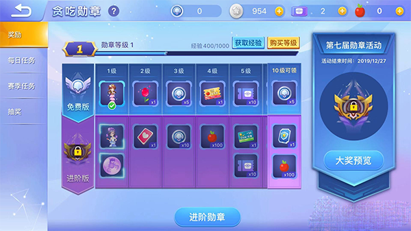 3、贪吃勋章。这是等级制度的,每升一级就会获得不同的奖励,大家可以在“每日任务”中去完成任务,以此来获得经验从而升级。
