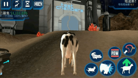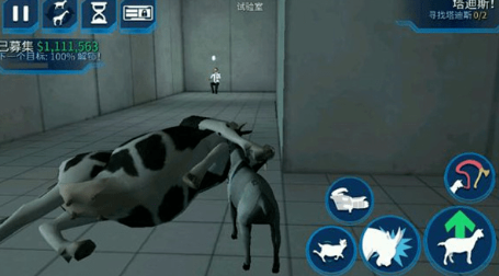 1、玩家来到试验室后会接到任务,进入试验室,这里我们需要进行四个实验,首先踩下中间的蓝色按钮,掉落下一头牛。