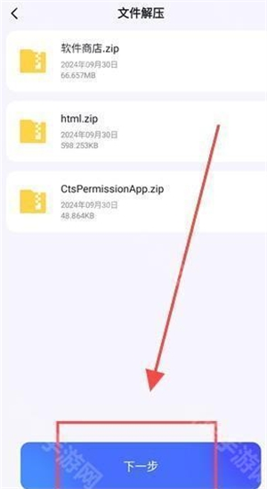 2、其次,进入文件解压界面,选择需要解压的文件,点击【下一步】按钮。