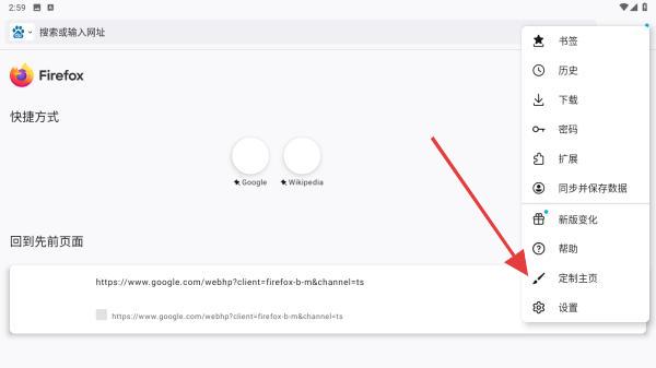 1、打开火狐浏览器,进入新标签页,点击页面右上角的齿轮图标,并找到定制主页的按钮。