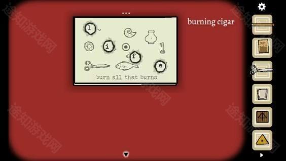 27、在打字机上输入burn后出现传单,用剪刀从中间剪开,再将两张纸重叠,根据纸上的提示「燃尽一切可燃之物」用雪茄将纸上可以被点燃的东西烧出洞,获得提示「life」