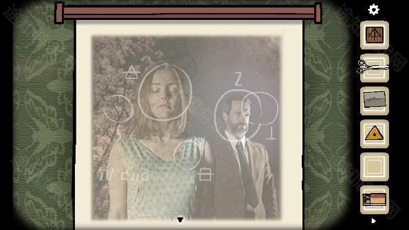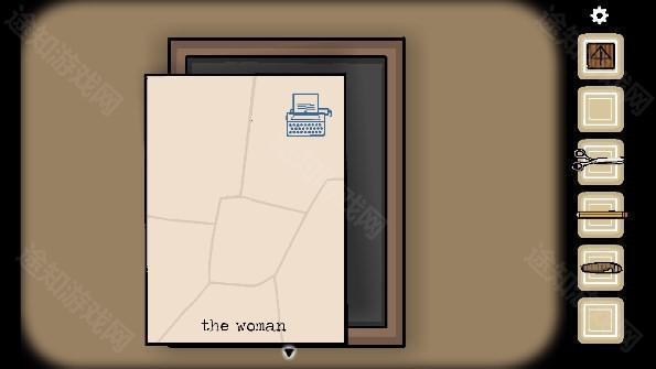 5、将五个碎片全部放在相框上获得提示「the woman」(中间有一个空格),点击打字机输入英文后出现一张纸,用铅笔涂抹纸上出现的男人、门、女人等,最后涂抹钥匙图案获得「钥匙」