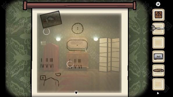 1、拿走衣架上的「大衣」,打开旁边的三层抽屉,拿走里面的「剪刀」、「照片碎片」和「铅笔」,打开门旁边的开关,来到右边拿走灯罩里的「照片碎片」