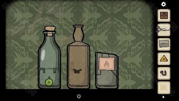 17、根据提示确定行进路线,完成后打开地球仪,根据三个瓶子上的提示,将火柴点燃放入第三个瓶子中,打破瓶子后获得「钩子」,用剪刀剪下一段花盆里的「树枝」,将叶子放进第二个瓶子中