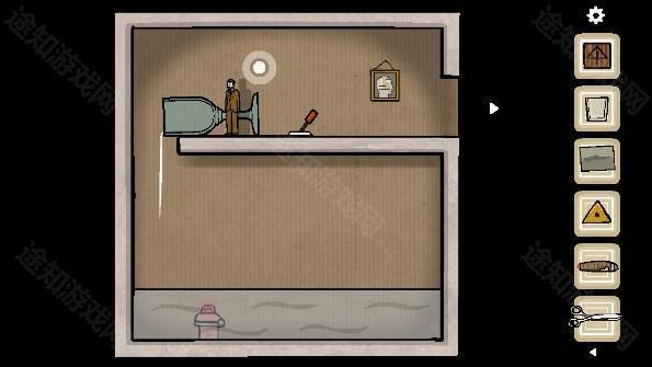 22、首先,控制男主从原始房间进入黄色房间,再进入粉色房间后坐电梯到达棕色房间,控制小人推到水杯,然后来到相框处退出小房间