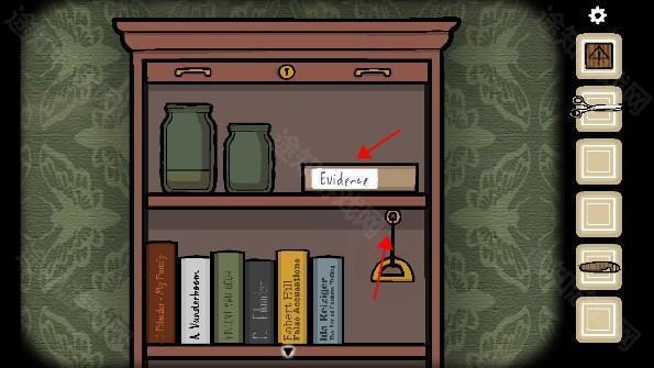 13、点击两次钥匙孔后出现眼睛,观察眼睛上的图案位置,转动时钟的指针至十二点四十五,打开暗格后获得「三角形钥匙」,用钥匙打开右边的抽屉获得「胶片2」和「手帕」,打开左边的抽屉是各种文件夹,里面有书架上摆放书位置的提示和一个「文件」