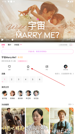 2、进入电视剧播放的页面内,点击下方缓存的功能按钮。