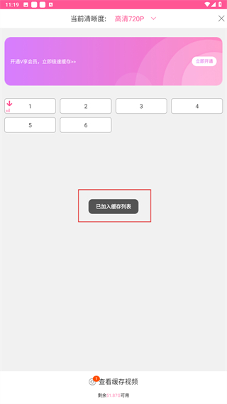4、当页面弹出已加入缓存列表的字眼后,表示缓存成功。