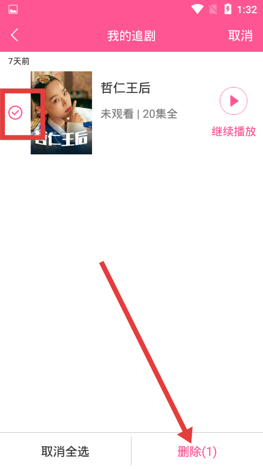 3、勾选要删除的追剧记录,并点击右下角的删除,即可删除观看记录。