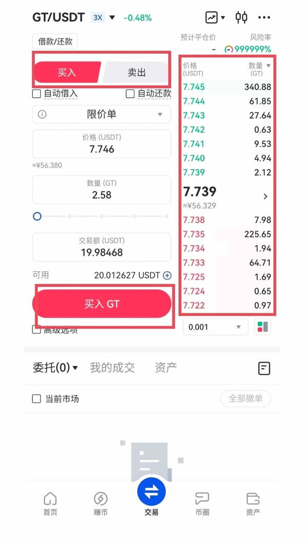 ①选择对应的交易对进行交易,会一并显示当前交易对杠杆倍数;