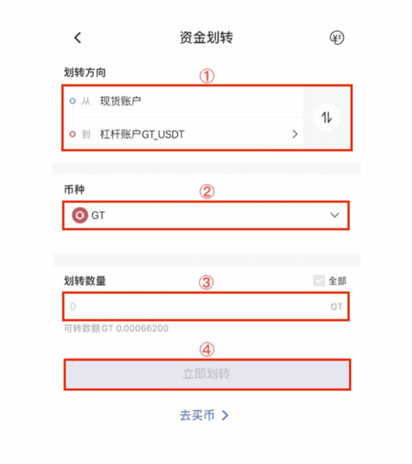 ①选择“划转方向”,从“现货账户”划转到“杠杆账户”或从“杠杆账户”划转到“现货账户”;
