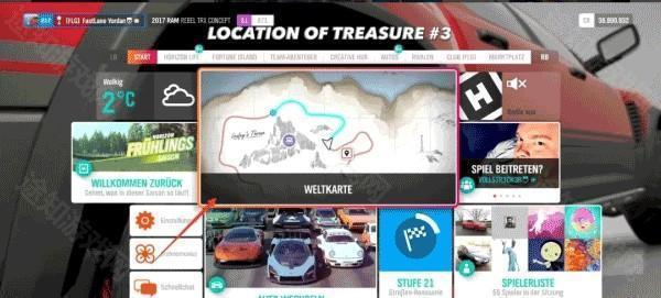 2、进入世界地图,寻找财富岛宝藏2,选择获取财富岛宝藏2路线,再查看比赛用 的车型。