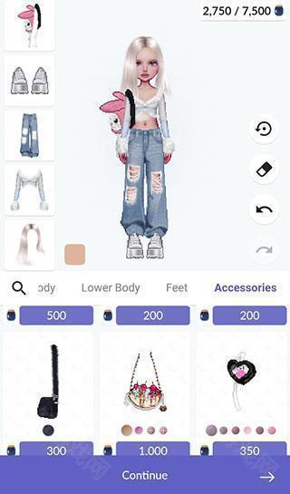 4、还可以为你的虚拟形象选择不同风格的包包,装饰完成后点击底部“continue”箭头!