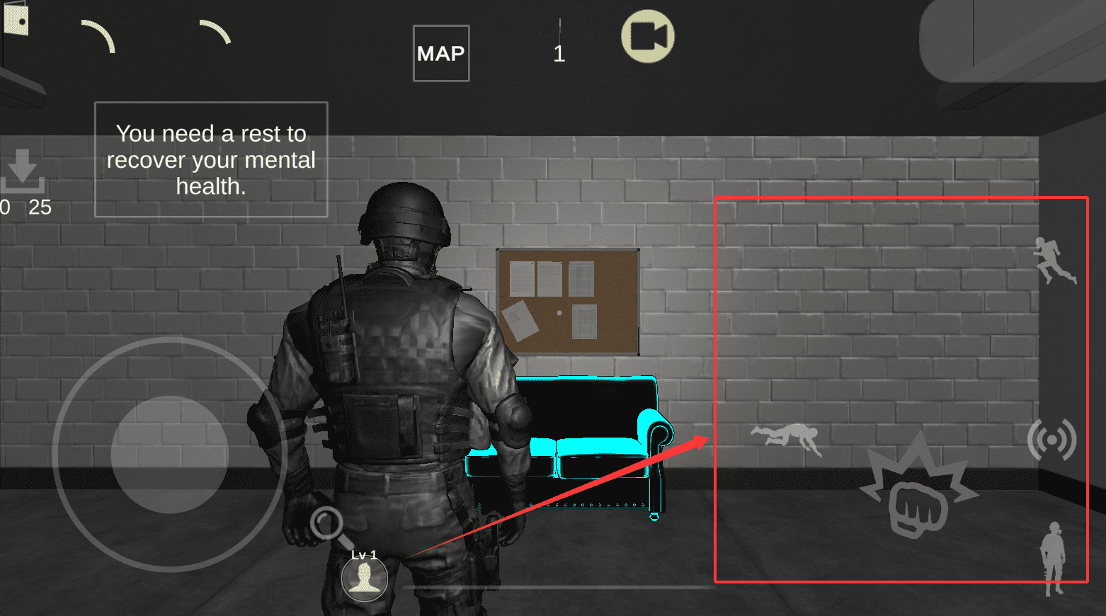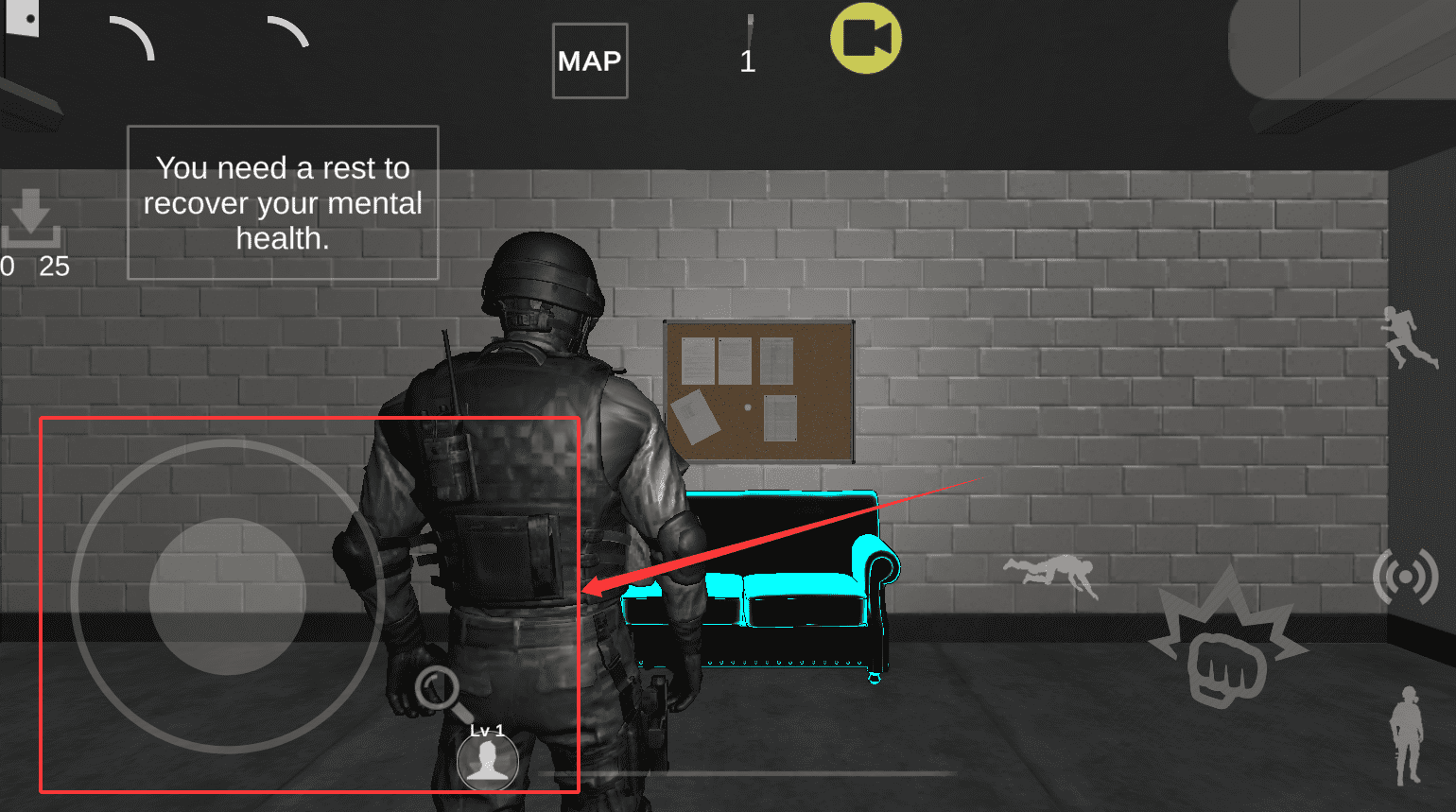 2、在游戏里的地图界面,也就是标着 MAP 的地方,你会看到一句提示说你得休息一下来恢复精神健康。