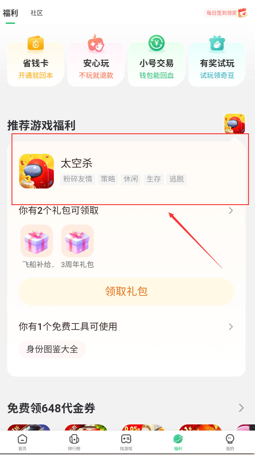 3、领取游戏福利时,进入福利或社区页面,查看省钱卡、有奖试玩等专区。