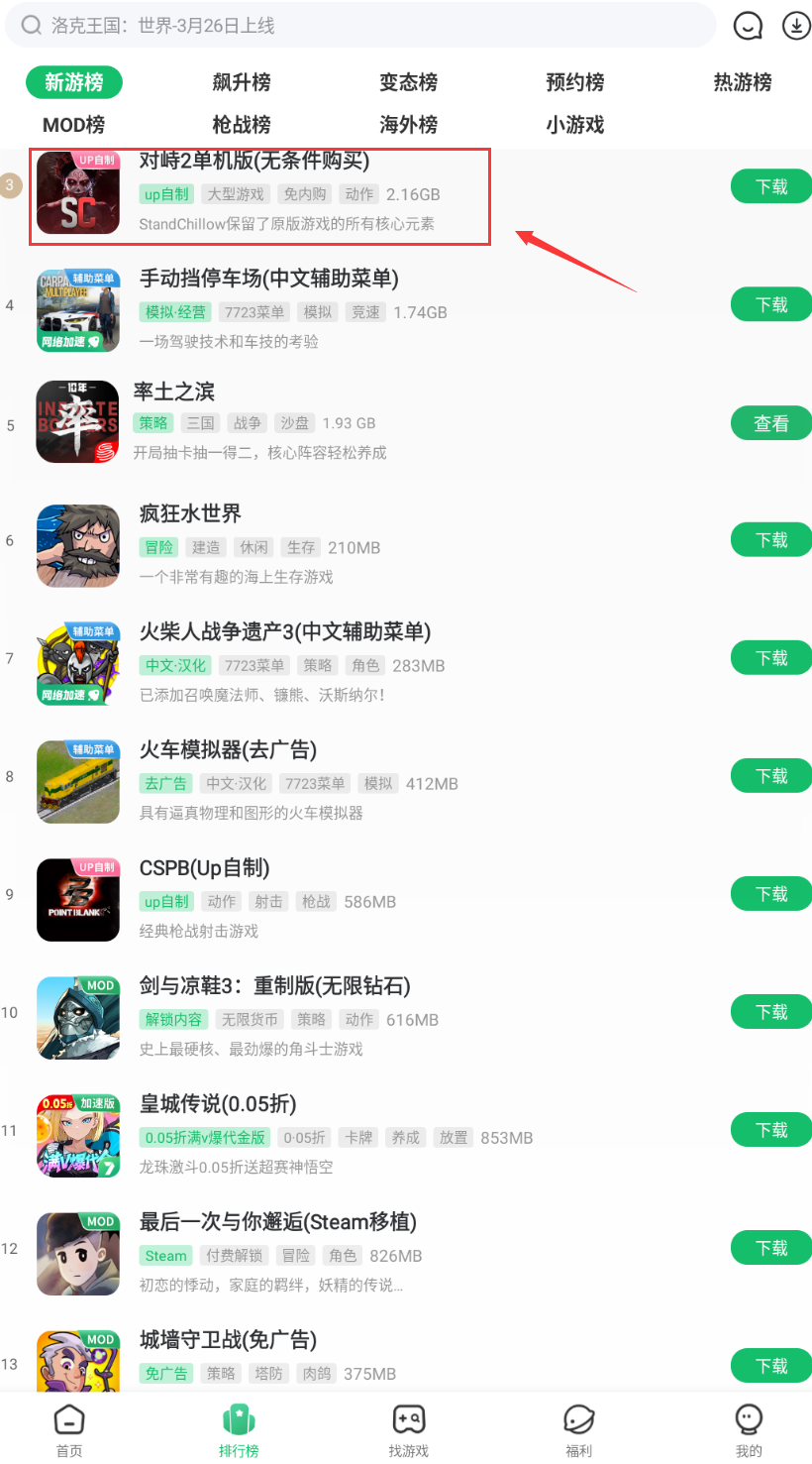 4、要下载新游榜或热门游戏,可先在排行榜或找游戏页面筛选。