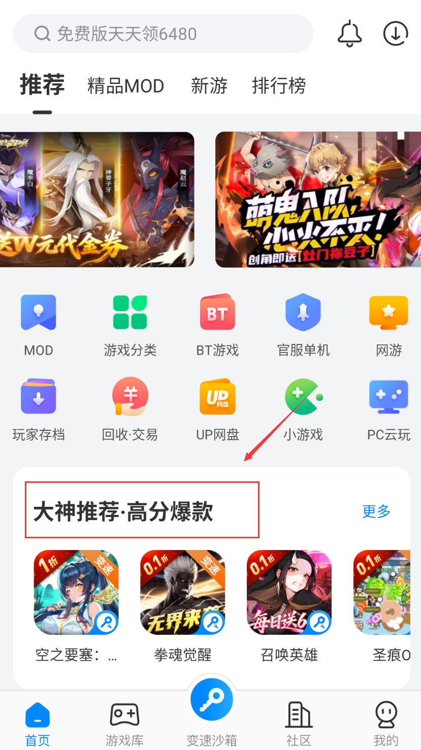 1、打开应用后,可以在首页顶部看到“游戏分类”和“大神推荐”等栏目。